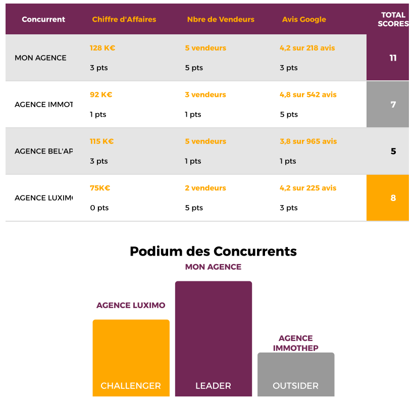 Une fois un minimum de 3 critères et 3 concurrents renseignés, l’HapplyX génère un Podium dynamique. Ce visuel classe instantanément le Leader (violet), le Challenger (orange) et l’Outsider (gris) sur la base de vos scores globaux.