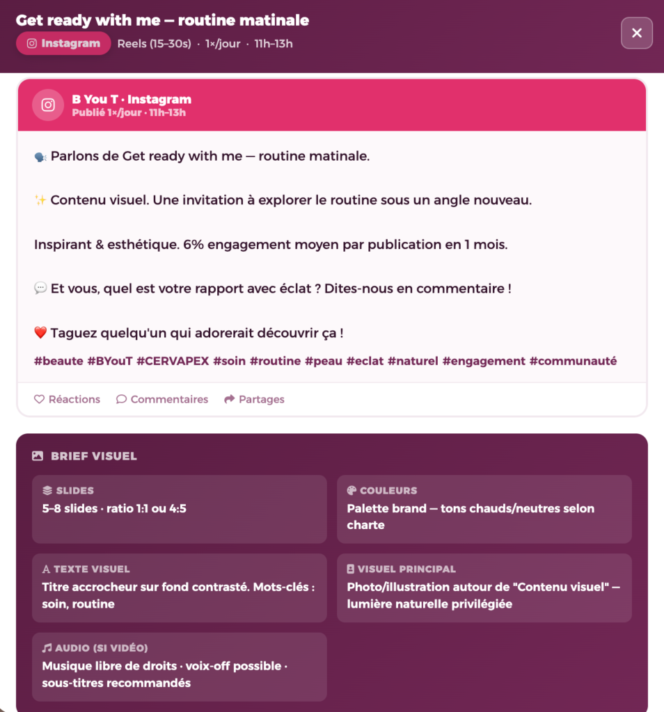 Pour chaque réseau et chaque thématique, accédez à des exemples de posts prêts à l’emploi avec texte, hashtags et appel à l’action — personnalisables en un clic.