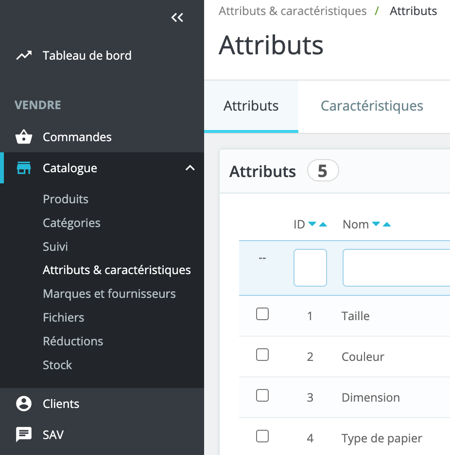 - Dans le menu latéral, allez dans Catalogue > Attributs & Caractéristiques.