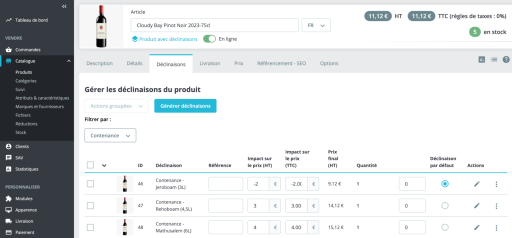 - Cliquez sur l’onglet Déclinaisons (en haut de la fiche produit).