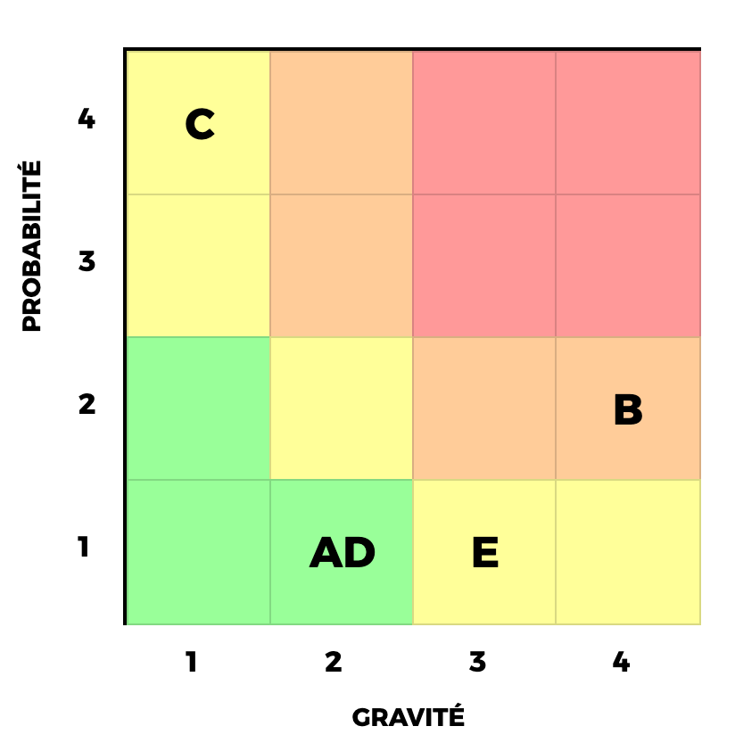 - Évaluation (P x G) : Sélectionnez pour chaque risque sa probabilité et sa gravité sur une échelle de 1 à 4.