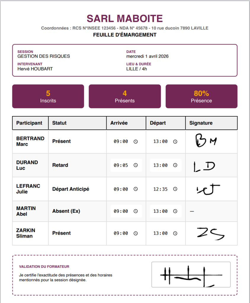 - Accessibilité et Mobilité : Conçu pour être responsive, il permet aux formateurs d’émarger directement en salle de formation sur une tablette, modernisant l’image de marque de l’organisme de formation.