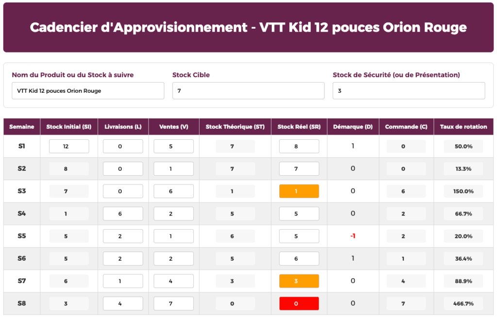 • Stock de Sécurité (ou de Présentation) : Votre zone rouge le temps que la prochaine livraison arrive. Si votre stock descend en dessous, l’outil vous alertera visuellement.