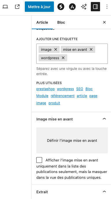 Pour affecter une image de mise en avant, il vous faut aller modifier une page puis, sur la marge de droite qui permet de la paramétrer, choisir Image mise en avant.